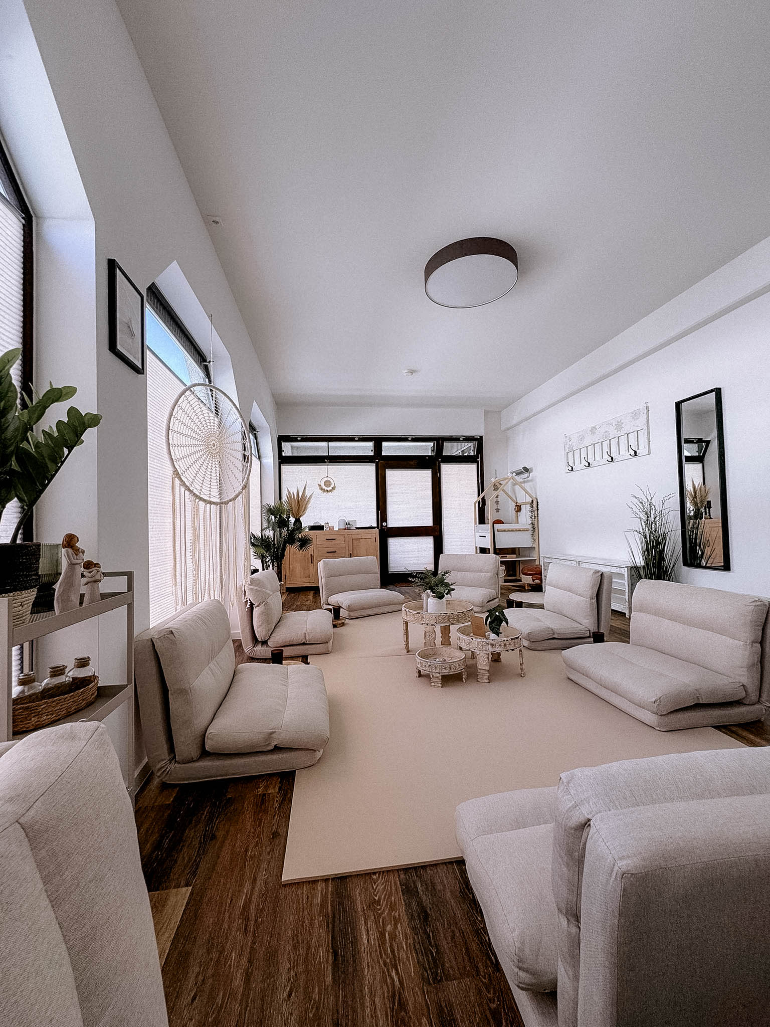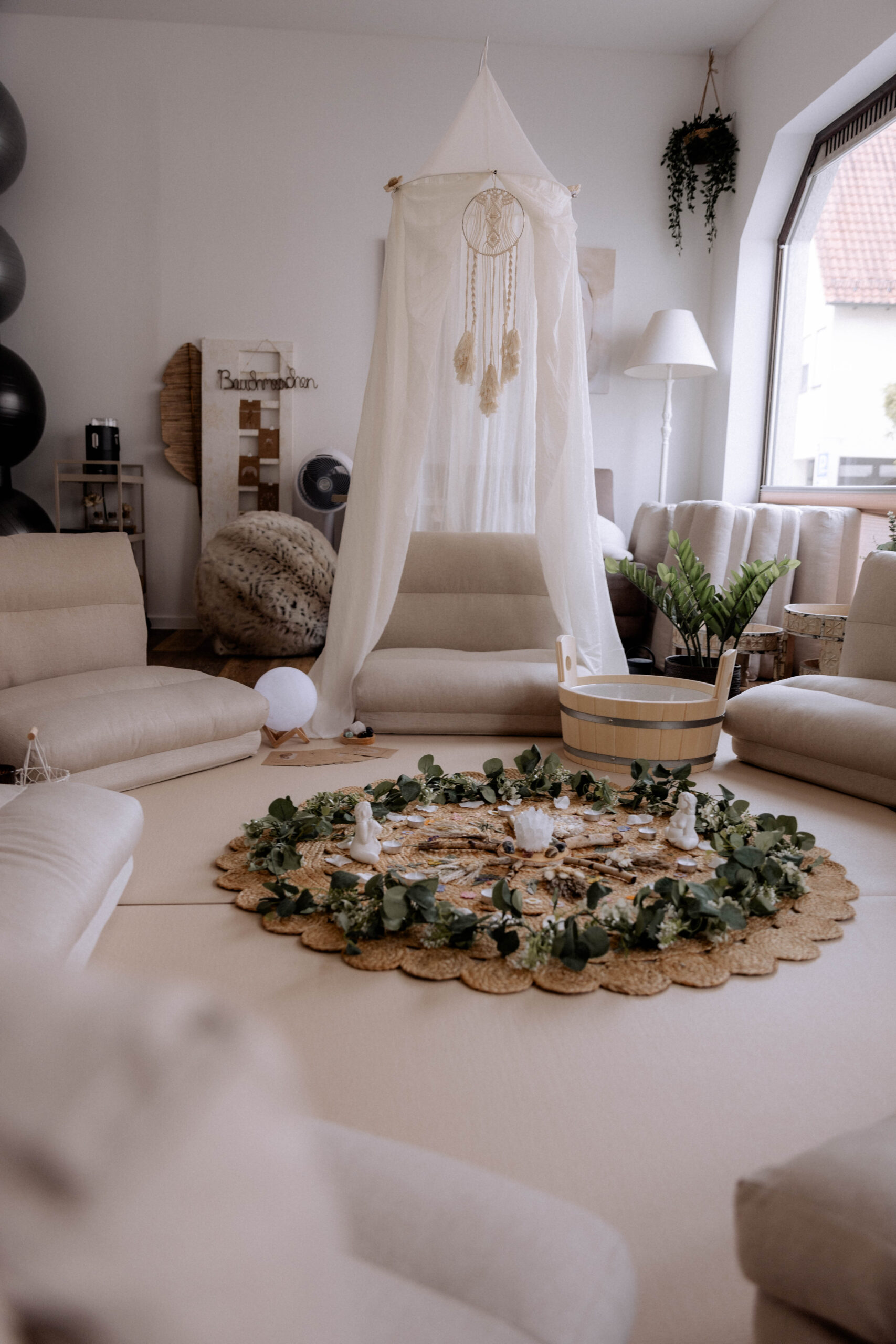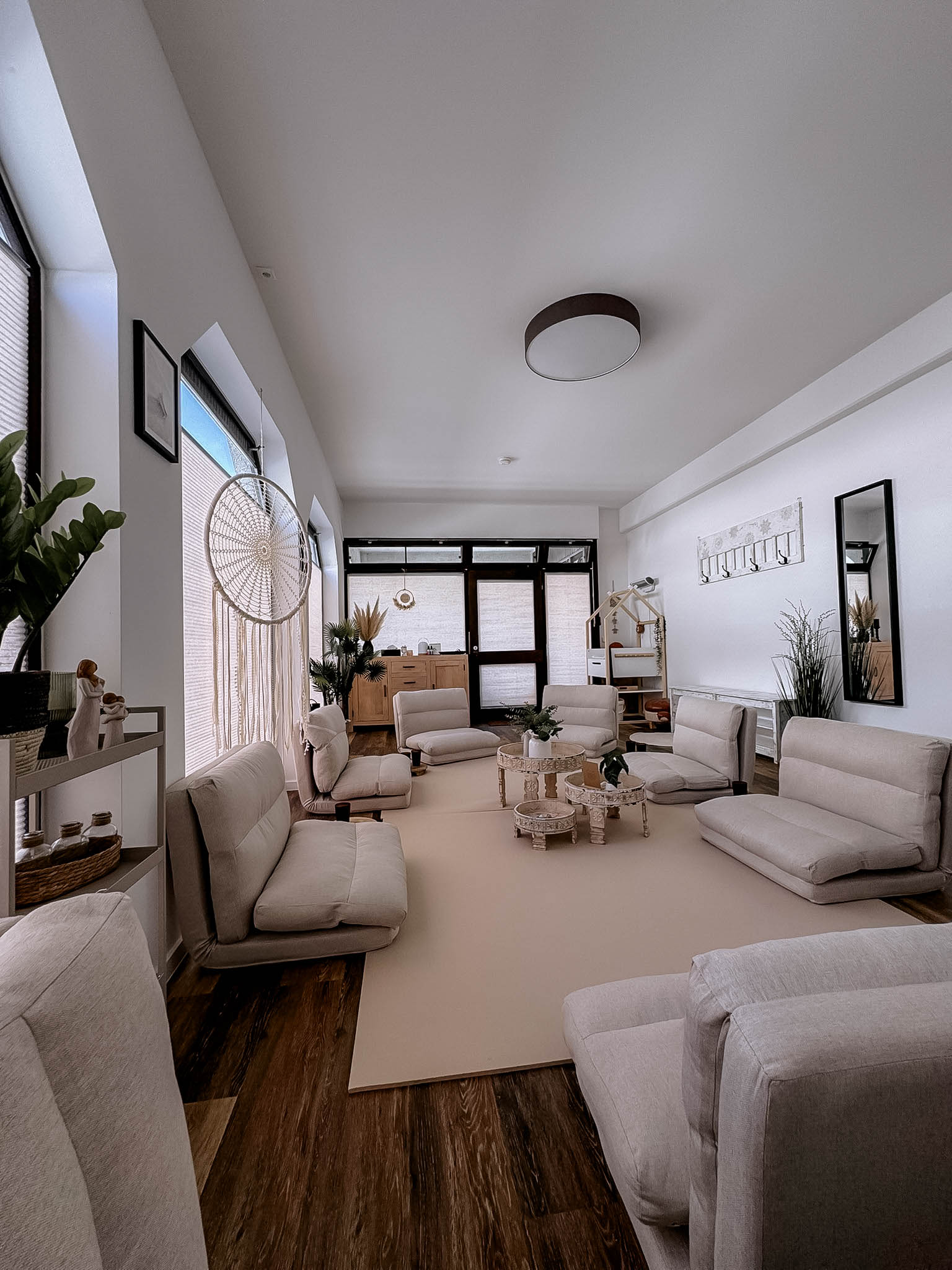 In meinem Kursraum habe ich viel Wert auf eine gemütliche und entspannte Atmosphäre gelegt, damit Ihr Euch wohlfühlt. Bequeme Sitzpolster laden zum Verweilen ein, und für die Kleinsten steht ein Wickeltisch bereit. Da drinnen keine Abstellmöglichkeiten für Kinderwagen bestehen, könnt ihr diese bequem im Hof hinter dem Haus abstellen.